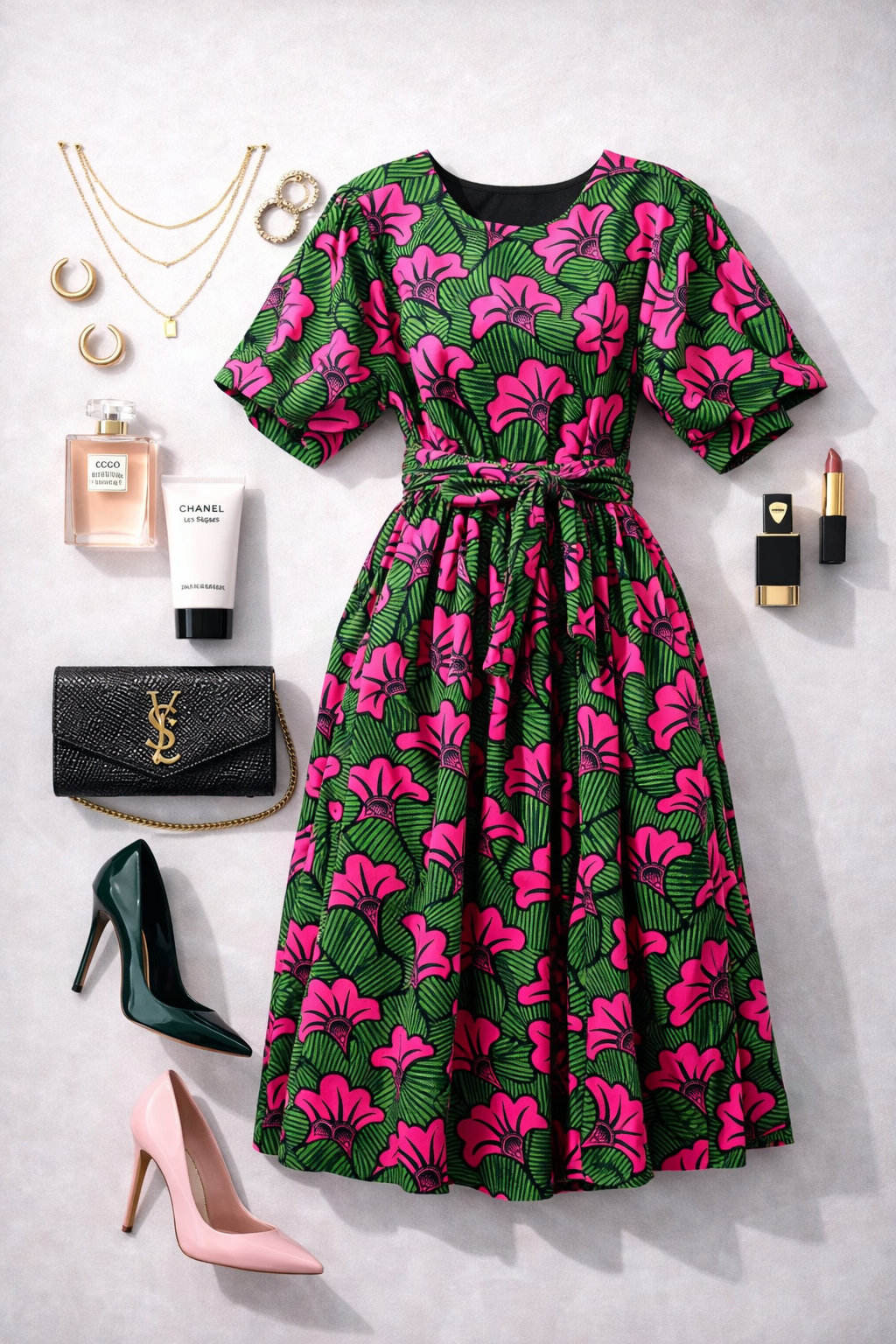 Crafted in a rich hunter green base adorned with vibrant fuchsia florals, this pleated midi dress strikes the perfect balance between bold expression and refined elegance. The soft pleating at the waist creates natural movement, while the built-in belt allows for a beautifully cinched silhouette without compromising comfort.